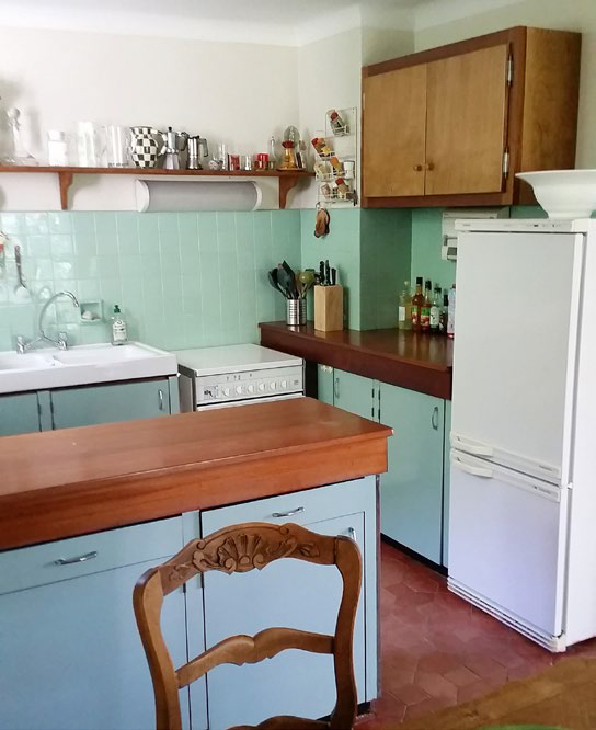 Die Küche ist mit Kühlschrank und Herd ausgestattet, Geschirr und Kochgerät sind vorhanden.